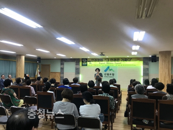 충남 예산군아동‧여성안전지역연대와 예산성폭력상담소(소장 이경옥)는 23일 예산군 산림조합 회의실 3층에서 여성인권영화 <그 인권은 가짜다(Equal Means Equal)>를 상영했다.