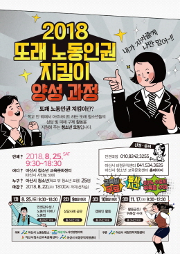 지킴이 양성과정에는 아산시를 중심으로 노동상담소, 비정규지지원센터, 노사민정협의회, 청소년교육문화센터가 참여하여 전문적인 역량을 활용한 인권 및 노동법 소양교육을 기본으로 해 수료증 교부 및 봉사시간 부여 등의 메리트가 있고 현장체험을 통한 사회학습 계기도 마련한다는 취지도 담고 있다.