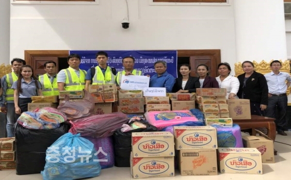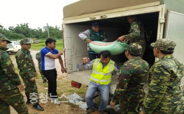 라오스 아타푸 주청사에 마련된 구호물품 접수처에서 한국서부발전 현지직원들이 구호물품을 전달하고 있는 모습