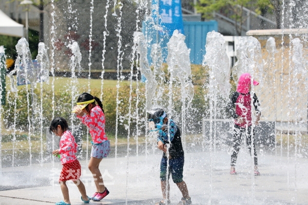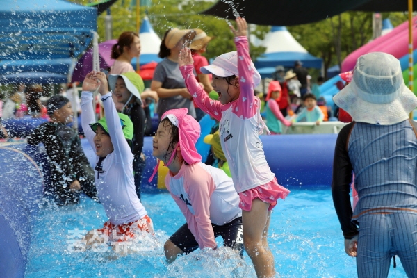 27일 관평동 동화울수변공원에 마련된 어린이 야외물놀이장에서 어린이들이 물놀이를 즐기고 있다.