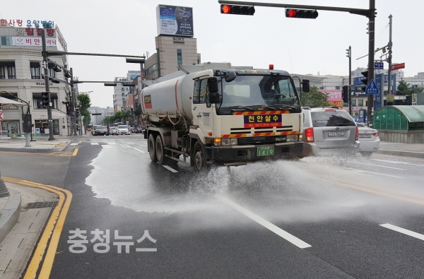 충남 천안시 동남구(구청장 주재석)는 폭염특보가 장기화 되면서 도심 온도를 낮추기 위해 시가지 주요 간선도로를 중심으로 살수작업을 실시하고 있다.