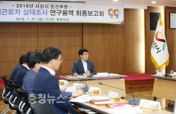 서산시에서는 27일 시청 중회의실에서 관련부서 실과장, 서산시 노사민정 협의회 위원, 연구용역 수행을 맡은 선문대학교 노동정책연구소 부소장 및 연구원 등 16명이 참석한 가운데‘서산시 민간부문 비정규직 근로자 실태조사 연구용역’최종보고회를 가졌다.