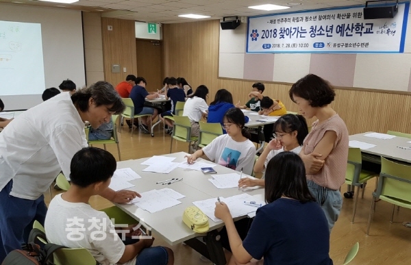 대전 유성구(구청장 정용래)가 지난 28일 유성구청소년수련관에서 ‘2018년 주민참여예산제 청소년 예산학교’를 개최한 가운데, 목원대학교 권선필 교수가 강사로 나서 청소년들에게 지역에 필요한 정책을 스스로 제안하고 예산을 편성해 보는 참여형 수업을 진행하고 있다.