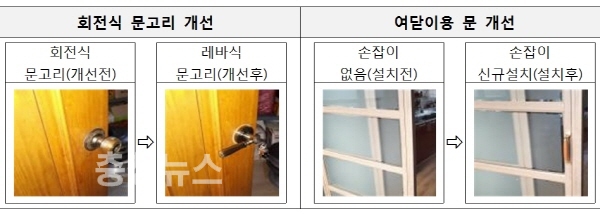 관내 536개소의 시설에 대해 전수조사를 한 뒤 지난 20일까지 척척세종 생활민원기동처리반은 2개 처리반이 일일이 현장을 돌며 662건(레버식 문고리 교체 250, 문 손잡이 부착 412건)의 교체작업을 진행했다.