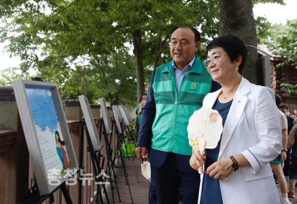 법동구민공원 숲속의 문고 시화전을 보고 있는 박정현 구청장