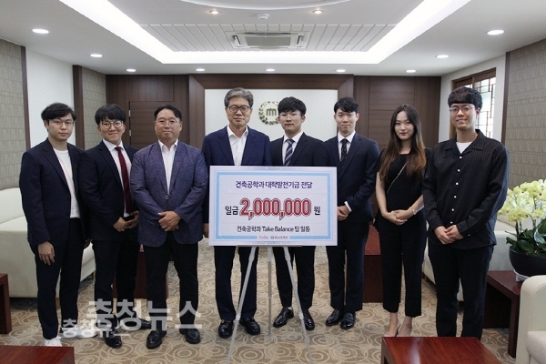 공과대학 건축공학과 학생들로 구성된 ‘T.B(Take Balance, 지도교수 : 김규용)팀’은 30일 오후 4시, 오덕성 총장을 방문해 건축공학과 발전을 위해 써 달라며 200만원을 기탁했다.