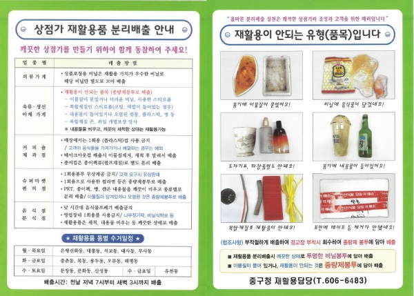 근본적인 문제를 해결하고자 생활쓰레기가 많이 배출되는 상점가를 우선으로 재활용품 분리배출 요령 홍보물 2천매를 제작해 배부할 예정이다.