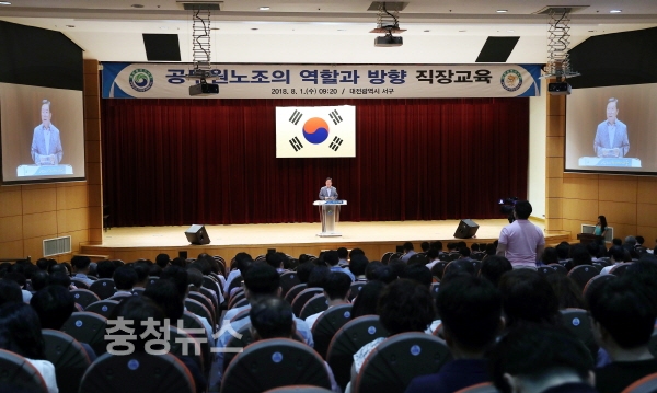 대전 서구(서구청장 장종태)는 1일 구청 대강당에서 장종태 서구청장을 비롯해 직원 400여 명이 참석한 가운데 ‘공무원노조의 역할과 방향’을 주제로 직장 교육을 했다.