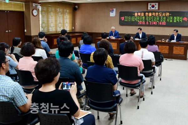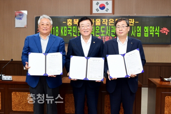 충남 홍성군은 지난 2일 군청 회의실에서 사)작은도서관만드는사람들, KB국민은행과 함께 2018 작은도서관 조성사업 협약식을 가지며 홍북읍 LH스타힐스 아동통합지원센터 내에 ‘한울 작은도서관’을 건립하겠다고 밝혔다.