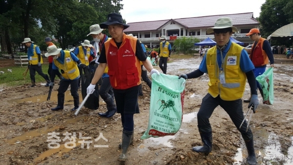 라오스 세남사이 고등학교 임시대피소에서 한국서부발전 구호봉사대와SK건설 구호지원단이 함께 대피소 정화활동을 진행하고 있는 모습
