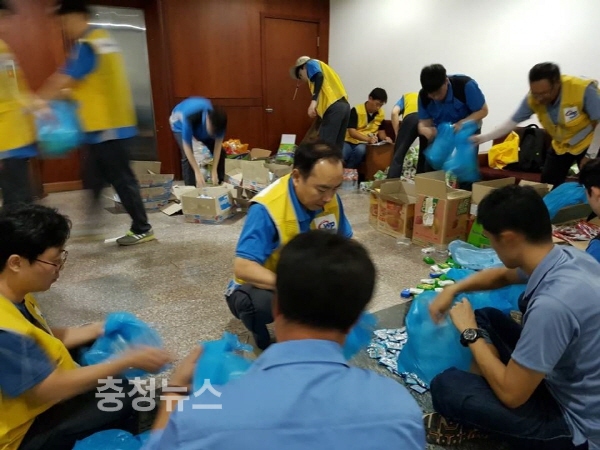 한국서부발전 구호봉사대가 야간에 다음날 이재민들에게 전달하기 위한식료품과 생활용품 등 구호물품을 바쁘게 포장하고 있는 모습