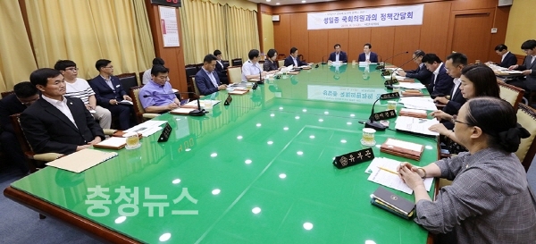 이어 △대산지역 대기보전특별대책지역 지정(안효돈 의원) △대산 정밀화학단지 조성(장갑순 의원) △해미읍성·순교성지 연계 한옥마을 유치(이수의 의원) △서령상가 청년몰 사업 국비 지원(최기정 의원) △도로기반시설 확충 지원 △가정용 전기요금 누진제 폐지(이상 안원기 의원)를 건의했다.