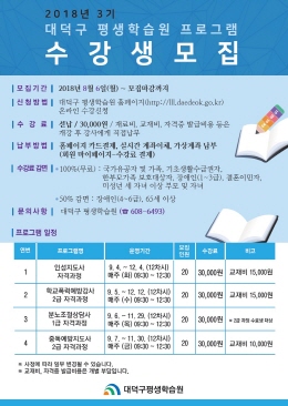 대전 대덕구 평생학습원(원장 문정순)이 6일부터 2018년 3기(9월~12월) 평생학습센터 프로그램 수강생을 선착순 모집한다.