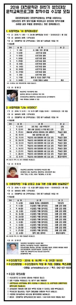대전문화재단(대표이사 권한대행 정해교)이 운영하는 대전문학관(관장 박진용, 이하 관장)은 시민 문학창작 기회 확대를 위한 2018 하반기 성인대상 무료 문학교육프로그램 수강생을 모집한다.