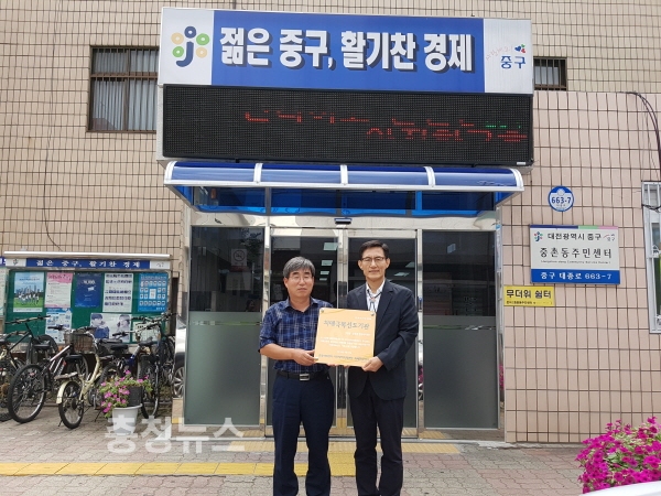 대전 중구(구청장 박용갑)가 8일 중촌동 행정복지센터를 ‘치매극복 선도기관’으로 지정하고 현판식을 가졌다.