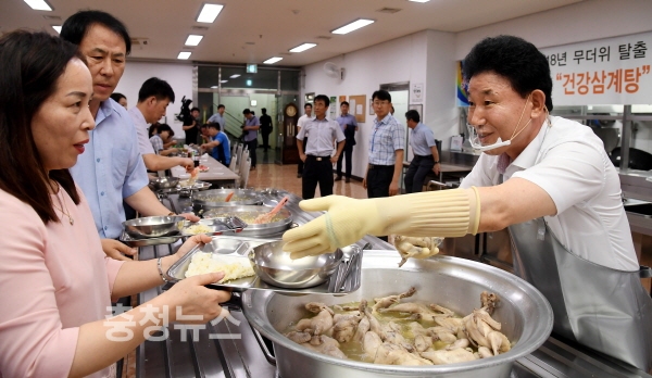 환경관리, 하수도․가로등 보수, 불법광고물 정비, 녹지관리, 주차단속 등 연일 이어지는 폭염에도 묵묵히 현장의 최일선에서 근무하는 직원을 초청해 박 청장이 직접 삼계탕을 배식했다. 또한 함께 식사를 나누며 현장의 소리와 직원들의 건의사항에 귀 기울였다.