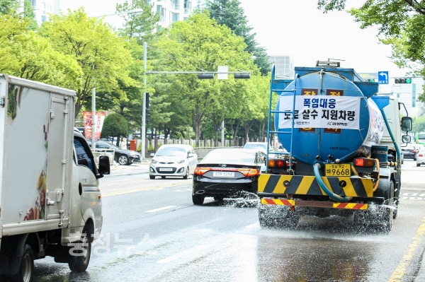 금성백조가 지원한 살수차 2대 중 둔산/용문권 운영 차량이 시내도로의 열기를 식히고 있다