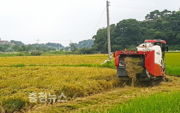 이날 4㏊의 면적의 첫 벼기에 나선 농가는 송석진 농가(당진3동)로, 지난 5월 8일 이곳에 극조생종인 ‘기라라397’을 모내기 했다.