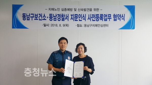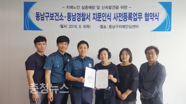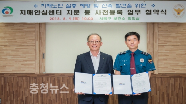 천안시 서북구보건소와 천안서북경찰서, 동남구보건소와 천안동남경찰서가 9일 오전 양 보건소에서 각각 ‘치매노인 실종 예방 및 신속 발견을 위한 업무협약’을 체결했다.