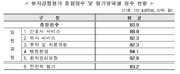 응답자들은 간호사서비스, 의사서비스, 투약 및 치료과정, 병원환경, 환자권리보장, 전반적 입원경험 등 6개 영역에 대해 평가를 했고, 평균은 83.9점으로 나타났다. 간호사서비스는 88.8점으로 점수가 가장 높았으나 의사서비스는 82.3점으로 가장 낮았다. 의사서비스 영역 중 세부적으로 환자를 대하는 태도는 88.8점으로 높은 수준이었으나 의사를 만나 이야기할 기회는 74.6점, 회진시간에 대한 정보제공은 77.0점이었다. 투약 및 치료과정 영역은 82.3점으로 낮았다.