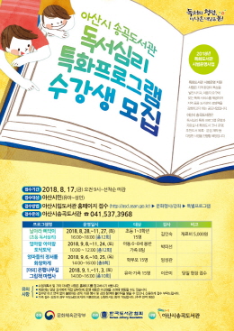 오는 17일 오전 9시부터 아산시립도서관 홈페이지를 통해 선착순 접수 예정이며 문의는 041)537-3968로 하면 된다.
