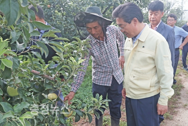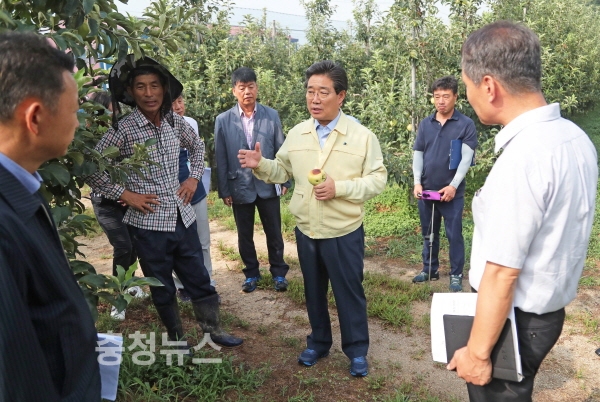 김홍장 당진시장이 10일 봄 냉해와 여름 가뭄으로 어려움을 겪고 있는 순성면 과수농가와 신평면 밭 농가를 방문해 피해현황을 직접 점검했다.