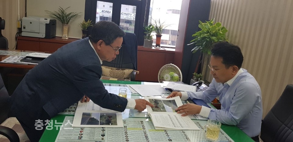 노박래 군수가 고규창 지방재정경제실장을 만나 지역현안을 설명하고 있다.