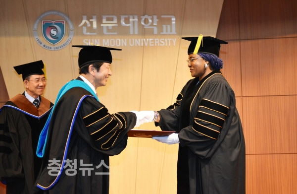 선문대학교(총장 황선조)는 13일 선문대 국제회의실에서 아이샤 부하리(Aisha Muhammadu Buhari) 나이지리아 영부인에게 명예박사학위(행정학)를 수여했다.