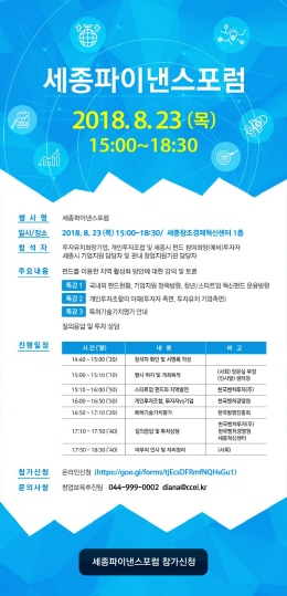 세종파이낸스포럼은 세종시 펀드조성을 위해 처음으로 개최되는 투자관련 행사로 공공투자자, 민간투자자, 투자를 유치하는 기업이 한자리에 모여 서로의 이해관계에 대한 논의를 통해 세종시 투자생태계조성의 필요와 발전방향을 이끌어갈 계획이다.