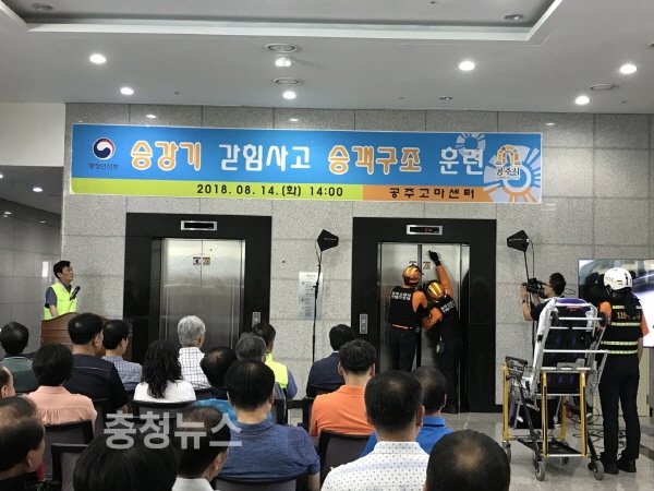 충남 공주시(시장 김정섭)가 지난 14일 고마 컨벤션홀에서 ‘2018년 승강기 사고대응 승객구조 합동훈련 및 관리자 안전교육’을 실시했다.