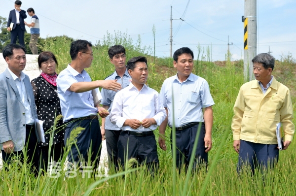이어 벼농사를 짓고 있는 구룡면 농가를 찾아 상황을 살폈다. 가뭄으로 인해 물대기가 어려워 벼가 시들고 고사가 나타나 용수 공급이 절실했다.