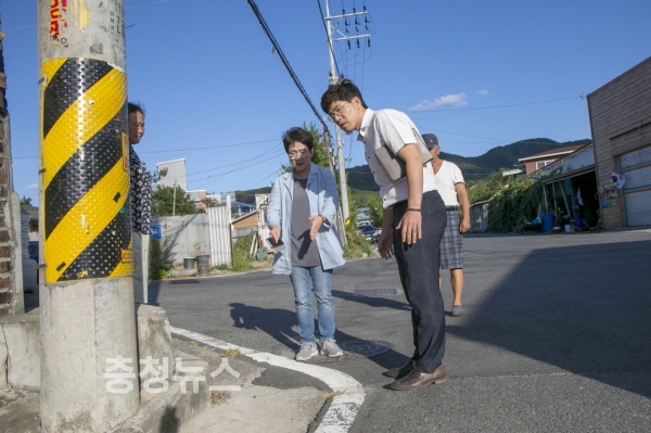 지난 17일 박정현 대덕구청장이 전날 목요공감데이트에서 제기된 민원현장을 담당직원과 찾아 건의한 주민과 대화하는 모습
