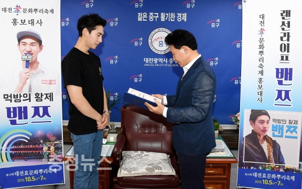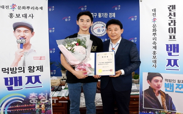 대전 중구(구청장 박용갑)는 지난 17일 구청장실에서 제10회 대전효문화뿌리축제 홍보대사로 유튜버 밴쯔(본명 정만수)를 위촉했다.