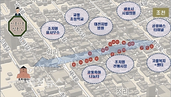 행안부의 사업지역 평가를 거쳐 사업 대상지로 선정된 조치원로 상가밀집 지역은 20년 이상 노후건물 비율이 83.9%나 되고 각종 불법 광고물이 무질서하게 난립해 있어 정비가 시급한 지역으로 꼽힌다.