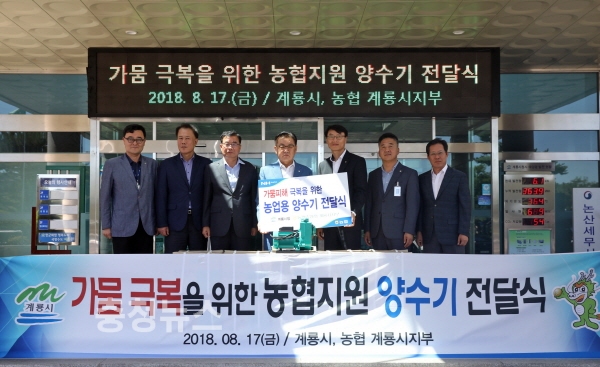 농협계룡시지부(지부장 최운재)는 지난 17일 계룡시청에서 가뭄 극복을 위한 양수기 전달식을 가졌다.