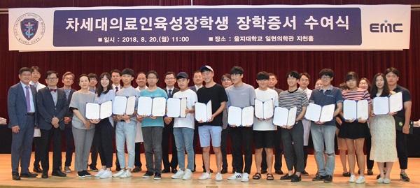 을지대학교(총장 홍성희)는 20일 오전 대전캠퍼스 일현의학관 지천홀에서 ‘2018 차세대의료인육성장학생’ 장학증서 수여식을 개최했다.