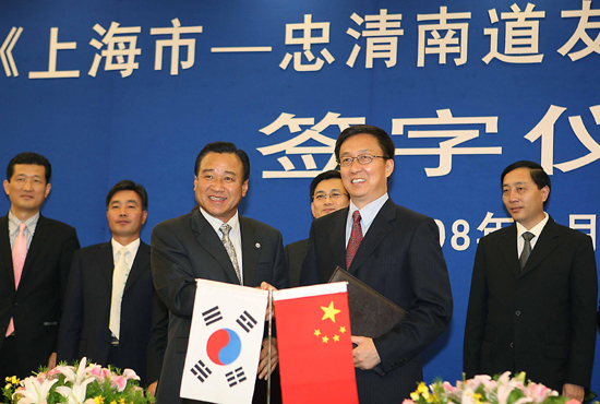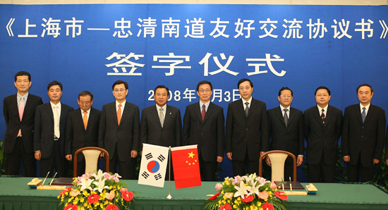 이완구 충남도지사가 3일 중국의 경제중심지인 상하이시를 방문, 상하이시청에서 한정(韓正) 시장과 우호교류협력 협정서에 서명했다.