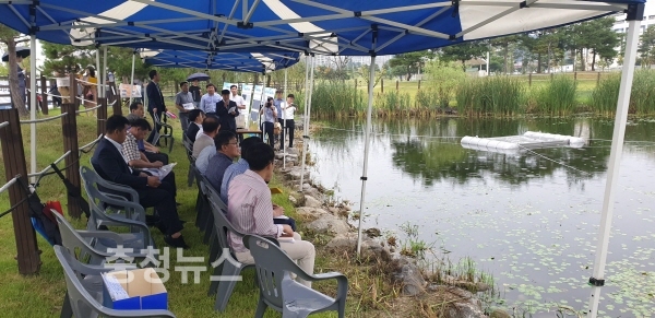 이번 시연회는 구본영 천안시장을 비롯해 관련 공무원, 한국농어촌공사 담당자, 전문 교수 등이 참석한 가운데 나노버블을 이용한 업정저수지 수질을 개선할 수 있는 방안에 대해 논의하는 자리였다.
