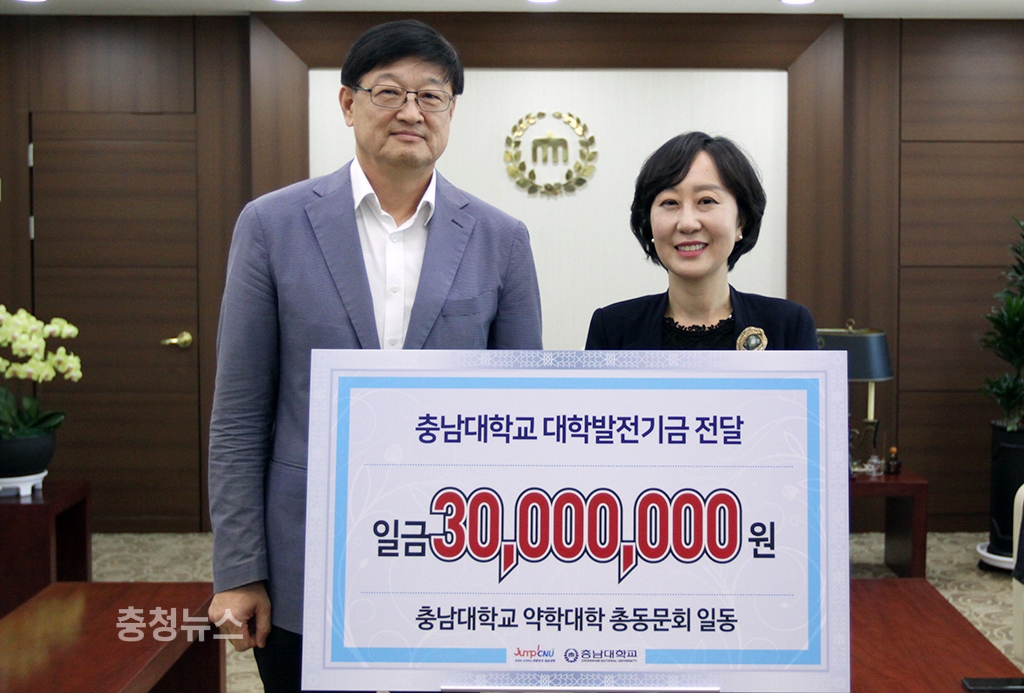 충남대 약학대학 총동문회와 ㈜중앙백신연구소 김은희 동문이 약학대학 발전기금을 기부했다.