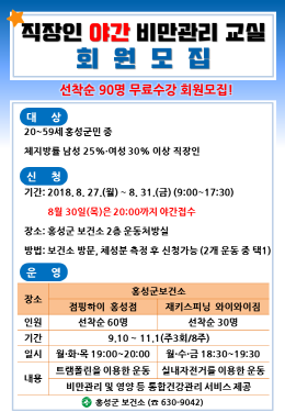 충남 홍성군 보건소에서는 체중조절이 어려운 직장인을 위한 야간 비만관리교실 ‘일도 몸도 S클래스’ 프로그램 참가자 90명을 선착순 모집한다고 23일 밝혔다.