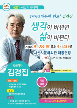 충남 서산시는 이달 28일 서산시 문화회관 대공연장에서 인문학자 김경집 교수를 초청해 “생각이 바뀌면 삶이 바뀐다”라는 주제로 제57회 서산아카데미를 개최한다.