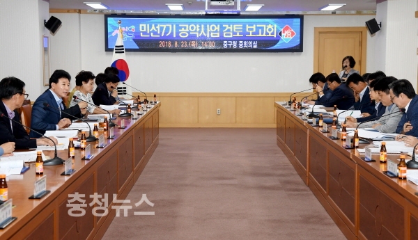 중구의 민선7기 공약사업은 ▲구민회관 건립 ▲제2뿌리공원 조성 ▲독립운동가 거리 조성 ▲안전하고 편안한 복지환경 조성 ▲깨끗한 중구 만들기 등 5대 공약 24개 세부사업이다.