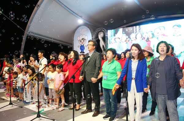 지난 25일 전민동 엑스포근린공원에서 열린 제16회 한여름밤 마을축제에서 정용래 유성구청장(앞줄 오른쪽에서 네 번째)을 비롯해 공연자와 관객들이 한데 어우러져 전체 합창