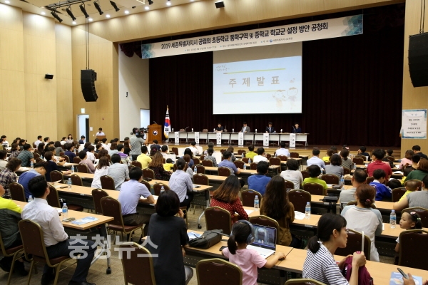 세종특별자치시교육청(교육감 최교진)이 27일 정부세종컨벤션센터 국제회의장에서 「2019 세종시 공립 초등학교 통학구역 및 중학교 학교군 설정 방안」을 주제로 입주민, 이해관계자, 전문가, 시민 등 200여 명이 참여한 가운데 공청회를 개최했다.