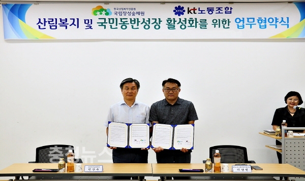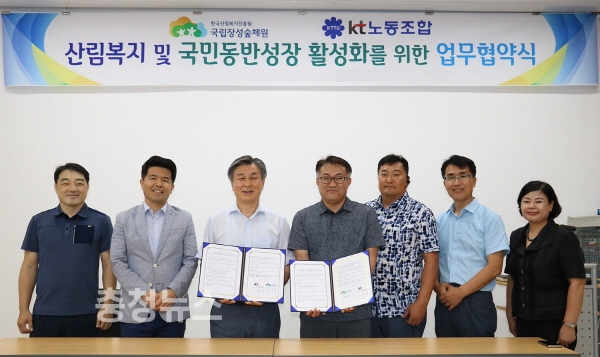 산림청 한국산림복지진흥원(원장 윤영균)은 소속기관인 국립장성숲체원(원장 박산우)이 KT노동조합전남지방본부(위원장 정광우)와 ‘산림복지 국민동반성장을 위한 업무협약(MOU)’을 28일 체결했다.