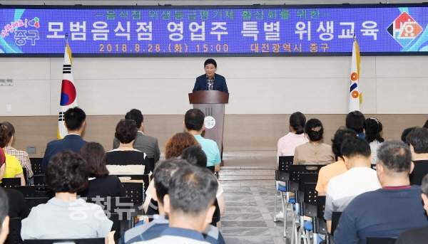 대전 중구(박용갑 구청장)는 28일 청사 대회의실에서 위생등급 활성화를 위한 모범업주 특별위생교육을 실시했다.