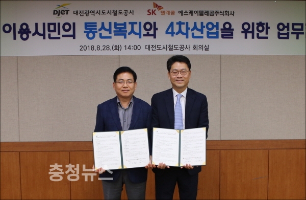 대전도시철도공사(사장 김민기)는 28일 SK텔레콤(중부인프라본부장 김정복)과 MOU를 체결하고 최고의 통신환경 제공으로 도시철도 이용 고객의 통신만족도 향상과 지역 사회공헌에 적극 협력하기로 했다.
