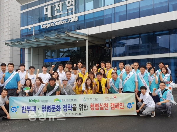 산림청 한국산림복지진흥원(원장 윤영균, 이하 진흥원)은 28일 대전역 일원에서 한국임업진흥원(원장 구길본), 국민건강보험공단 대전중부지사(지사장 한길호), 대전복지재단(대표이사 정관성) 등 임직원 40여 명이 반부패·청렴실천 합동 캠페인을 벌였다고 28일 밝혔다.