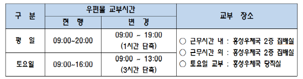 홍성우체국(국장 이계연)에서는 근로기준법 개정(공포´18.3.20)시행에 따른 주 52시간 근로체계 정착을 위해 2018년 9월 1일부터 보관우편물 교부시간을 아래와 같이 조정하여 운영하게 됨에 따라 지역주민에게 널리 알리고 이해를 구했다.