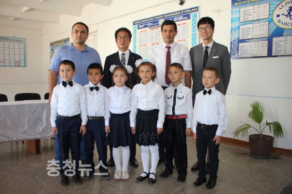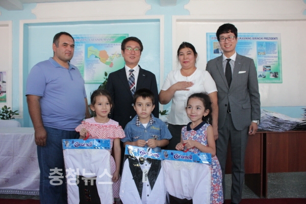 조폐공사 우즈벡 아동 교복 전달식 <줄 왼쪽에서 두 번째 GKD 이문표 대표>